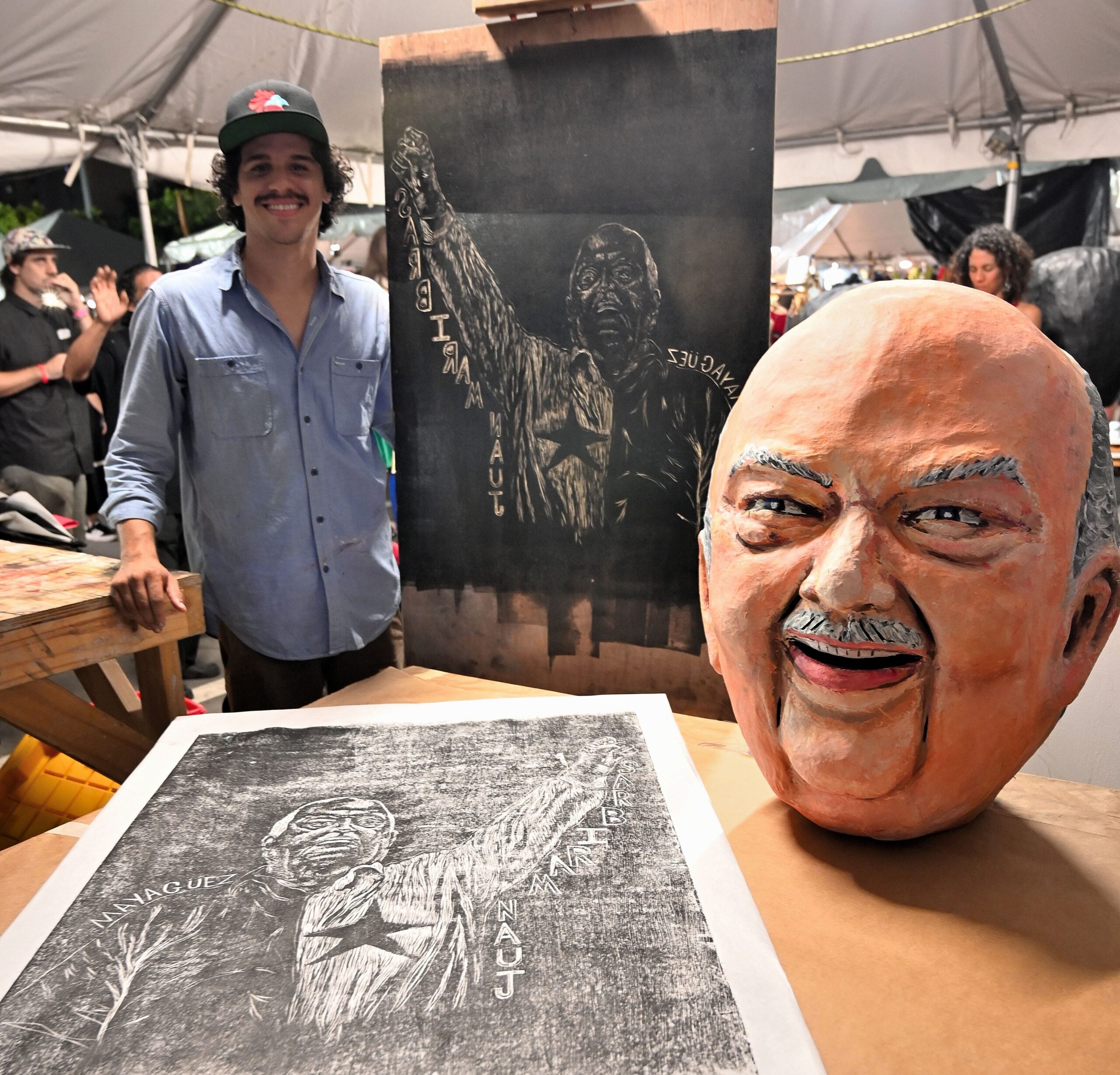 Más allá del arte oficial del evento, incontables piezas de arte bruñían bajo las carpas y entre las mesas de artesanía. La sátira cundió en suéteres, calcomanías y prendas; los libros, entre la mercancía de las librerías que dijeron presente. Un poco de todo se reunía en la carpa de la Claritienda, contigua a la Tarima Elliott Castro Tirado. Encima del escenario, periodistas como Nydia Bauzá, Nelson del Castillo y Millie Gil animaban la tarde que se hacía noche. El primer día del Festival comenzó al son de Mikie Rivera y la Brigada y Mapeyé