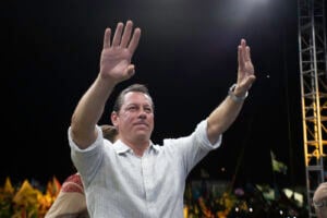 Se podía presentir el ambiente que iba a haber. Desde el mediodía, guaguas escolares repletas de gente, carros abanderados, bicicletas, scooters y todo tipo de transporte afluía al Distrito de Convenciones como un río de múltiples colores. Dentro del Lote 4, donde el suelo fangoso embarraba los tenis de las personas, un mar de monoestrelladas enhiestas ondeaba al son de merengue, reguetón y otros ritmos. Era un amplio vaivén de flamas en multicolor. A cada estaca, escoba y palo en que se engancharon las banderas, una plétora de manos jóvenes y mayores vestían de camisetas alusivas a los estribillos virales de “Jenniffer mentirosa”, “Muerte al PNP” y otros en apoyo a la figura de Juan Dalmau Ramírez, candidato a la gobernación, y la Alianza de País que el exsenador lidera. Sobre las cabezas que conformaron este mar, una carpa con la cara de Dalmau emanaba un olor a frituras que, a su vez, perfumaba el ambiente con aromas de festival y no campaña. Y así siguió la tarde.