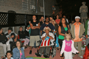 Cuando los músicos tomaban un receso, algunas personas iban a ver la Casita por dentro y salían muy complacidas de ver la colección de artesanías, las fotos de Lin Velázquez de otros bailes de bomba y los objetos de antes que la gente dona para enriquecer el ambiente de pueblo que es el mensaje visual de la Casita. Luis Rosa –ex prisionero político- también aprovechó el receso para echar un vistazo y para darle relevo a un tamborero. Hace dos años, cuando la Casita fue el lugar del multitudinario recibimiento a los recién excarcelados patriotas, Luis dio un discurso muy breve y enseguida se sentó a repicar tambores para ponerse al día con el sabor del barrio del que lo habían separado por veinte años. Ahora estaba de nuevo en el vecindario como artista invitado y había terminado un mural de expresión callejera en la pared de Vida-Sida, la agencia comunitaria de prevención creada por el Centro Cultural Puertorriqueño.