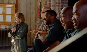 Si nos llevamos por la sinopsis del filme, pensamos que conocemos esta trama de principio a fin. Pero, aunque esto es cierto, hay factores que hacen de Sing Sing un filme muy especial. Número 1: el actor Colman Domingo. La 1era vez que lo vi como protagonista fue en Rustin (George C. Wolfe, 2023), interpretando al activista afroamericano Bayard Rustin, organizador de la marcha en Washington, D.C. en 1963. Pero la 2nda vez que veo su trabajo actoral es como Mister en la versión musical de The Color Purple (Blitz Bazawule, 2023) y, por + que traté de entender esta adaptación de la novela de Alice Walker—que ya había sido adaptada por Steven Spielberg en 1985 con un elenco maravilloso compuesto por Whoopi Goldberg, Oprah Winfrey y Danny Glover como el detestable Mister—mi impresión fue un desperdicio de talento en un filme marcado por exageraciones a la 5ta potencia. Sing Sing se lee y ve como una obra de teatro: un escenario principal y espacios cerrados para las celdas, los ensayos, los contactos con la población penal. Es precisamente una historia/memoria de cómo organizar a un grupo de prisioneros en esta facilidad carcelaria de alta seguridad en la parte norte del estado de Nueva York. Su director teatral, Brent Buell (un extraordinario Paul Raci), tiene la paciencia, dureza y conocimiento del teatro para lograr crear un grupo que pueda trabajar junto a pesar de sus diferencias y agresividad. Sin duda, John Divine G Whitfield (Colman Domingo) es el centro de energía que logra, la mayor parte del tiempo, resolver conflictos, dar confianza a los que temen hacer algo diferente, imponer su criterio sin caerle encima a nadie. Es hermosísimo cómo logran coger pedacitos de obras y crear su propia expresión teatral.