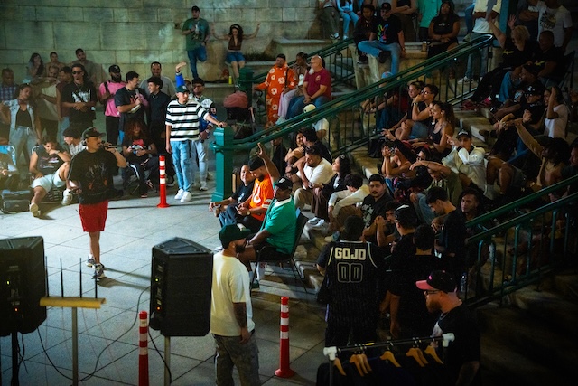 Al filo de las 8:30, numerosos jóvenes ya se batían en duelo verbal, valiéndose de las ropas de sus adversarios, el clima, la audiencia y cualquier artificio disponible. Alrededor, parejas y corrillos llegaban poco a poco al área del tótem, acomodándose en las estatuas de los corderos, las barandas, los muros y los bancos. Los 16 jóvenes participantes progresaban según determinaba un jurado compuesto por exponentes como Jay PR, y debían improvisar de acuerdo con las métricas de barras que pautaba el grupo evaluador.