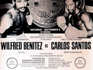 Santos tenía foja de 22-0 con 16 nocauts cuando recibió su primera oportunidad por el título mundial. El 14 de noviembre del 1981, él y Benítez hicieron historia al ser contendientes de la primera pelea por el campeonato mundial entre dos puertorriqueños, cuando boxearon en Las Vegas, Nevada . Benítez derrotó a Santos por decisión unánime en quince asaltos, reteniendo el título mundial de peso super walter del CMB en una pelea televisada por “HBO Boxing” .