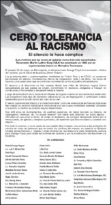 Los puertorriqueños y puertorriqueñas, residentes en Puerto Rico y en EEUU, no podemos permanecer en silencio. Condenamos, llenos de indignación, rabia y de dolor,  los actos de racismo y los asesinatos que se continúan cometiendo contra el pueblo afroamericano.