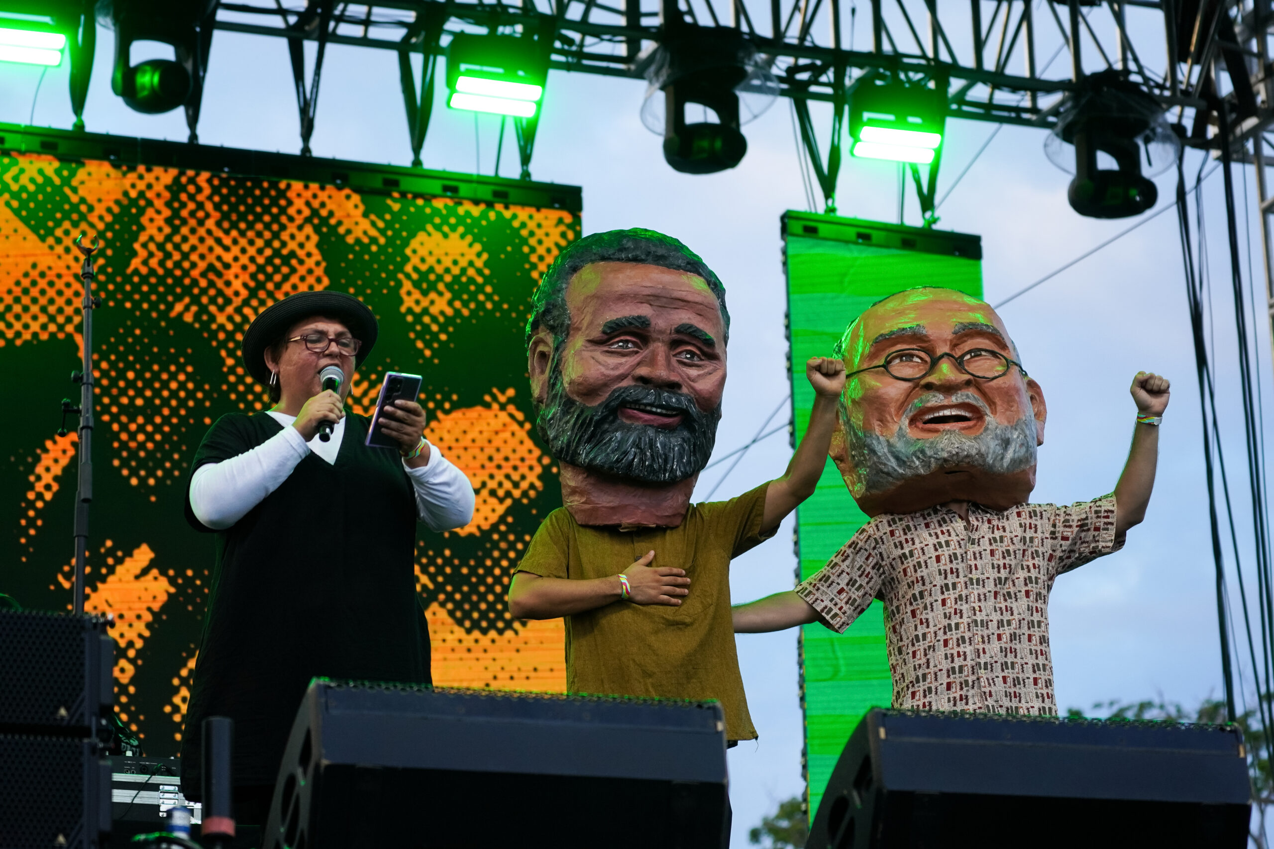 Ante el bullicio consistente de la audiencia y la música, la voz de Velázquez se extraviaba entre silbidos y aplausos. El barullo de artistas incluyó, también, al rapero Luis Díaz de Intifada, Chamir Bonano, el grupo Chuwi y, como cierre a la primera parte de la actividad, Fiel a la Vega. Todos estos artistas interpretaron temas relacionados con la identidad nacional y los estragos de la condición colonial que sufre Puerto Rico. Como “ñapa” a esta ristra de artistas, el cantautor de la Nueva Trova Roy Brown entonό “Boricua en la luna” junto a Tito Auger.