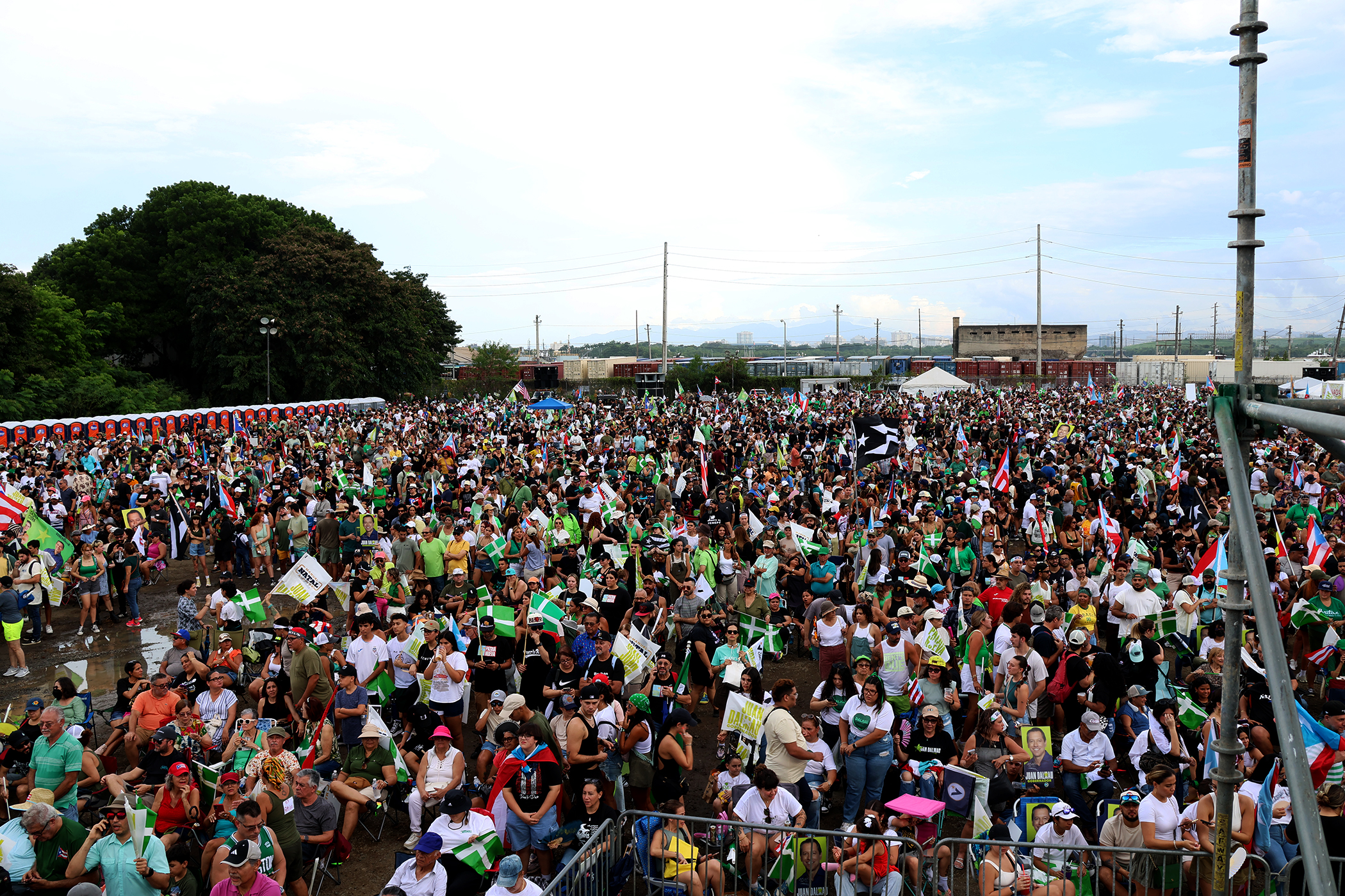 Se podía presentir el ambiente que iba a haber. Desde el mediodía, guaguas escolares repletas de gente, carros abanderados, bicicletas, scooters y todo tipo de transporte afluía al Distrito de Convenciones como un río de múltiples colores. Dentro del Lote 4, donde el suelo fangoso embarraba los tenis de las personas, un mar de monoestrelladas enhiestas ondeaba al son de merengue, reguetón y otros ritmos. Era un amplio vaivén de flamas en multicolor. A cada estaca, escoba y palo en que se engancharon las banderas, una plétora de manos jóvenes y mayores vestían de camisetas alusivas a los estribillos virales de “Jenniffer mentirosa”, “Muerte al PNP” y otros en apoyo a la figura de Juan Dalmau Ramírez, candidato a la gobernación, y la Alianza de País que el exsenador lidera. Sobre las cabezas que conformaron este mar, una carpa con la cara de Dalmau emanaba un olor a frituras que, a su vez, perfumaba el ambiente con aromas de festival y no campaña. Y así siguió la tarde.