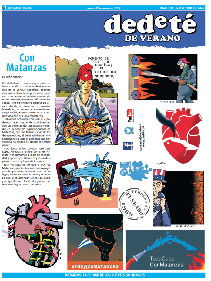 En el limitado concepto que sobre el humor gráfico publica la Real Academia de la Lengua Española, aparece este como el modo de presentar, enjuiciar o comentar la realidad, resaltando el lado cómico, risueño o ridículo de las cosas. Pero hoy nuestro dedeté de verano decide, sí, presentar o comentar la realidad, sin renunciar a nuestro encargo social, al humanismo ni a la responsabilidad que nos caracteriza.Hablamos del humor más útil que podemos hacer hoy, el de la solidaridad con las víctimas del lamentable incendio en la base de supertanqueros de Matanzas, con sus familias y las de los desaparecidos; el de la admiración y el respeto hacia todo el personal que con valentía ha estado allí desde el viernes último. Hoy, junto a los colegas José Luis López Palacios e Ismael Lema, de Palante, nos sumamos a la ola de solidaridad y apoyo que Matanzas y Cuba despiertan dentro y fuera de fronteras. Estamos seguros de que la querida Matanzas, que tantas veces nos acogió y en la que hemos compartido con colegas, volverá a tener el color y la belleza que la caracterizan. Al colega, socio y amigo Manuel Hernández y a los matanceros llegue nuestro abrazo.
