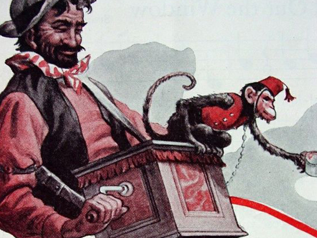 En la foto, un mono disfrazado de bufón; un organillero tocado de sombrero con voz ronca de tambor; un organillo con pata de palo y foto de novia y hermana. Mono y amo en la calle desierta, miran en derredor … no haynadie …