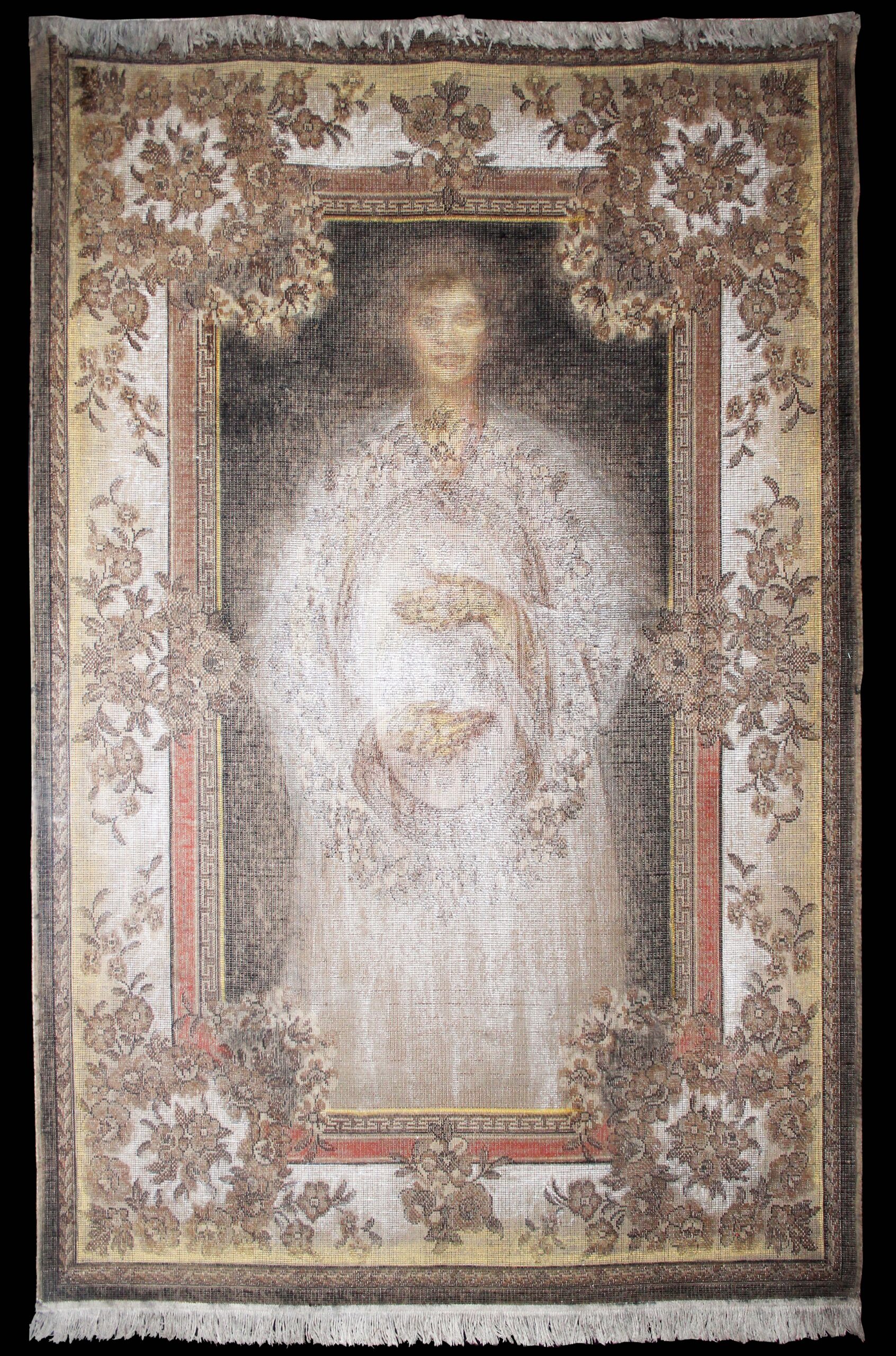 Consuelo (Las manos de Andrea) es una obra que nace de las entrañas de la memoria. La pieza consiste en un dibujo a carbón sobre una enorme alfombra de área. En la imagen vemos el rostro y el cuerpo casi alado, de una mujer vestida de blanco con las manos sobre su vientre. Esa mujer de mirada dulce y sonrisa de ancestral sabiduría, es Consuelo, la hermana mayor de Antonio Martorell. El artista quiso rendirle homenaje póstumo con este retrato que trabajó en el año 2019, poco tiempo después que ella falleciera. En ese momento, crear fue parte de su duelo por Consuelo.