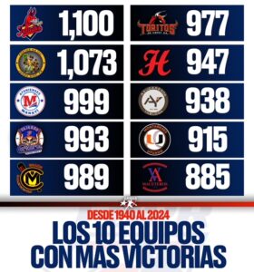 A continuación, presentamos una tabla con el total de juegos ganados por los 10 equipos de la AA que más victorias acumuladas desde 1940 al presente (Información fue provista por Héctor Luis Rosa Figueroa(Titito) Oficial de Prensa Federación de Béisbol de Puerto Rico)