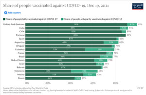 Hasta el pasado 18 de diciembre, unos 9.494.597 cubanos y cubanas ya contaban con el esquema completo de vacunación, lo que equivale a más del 95% de la población vacunable; así la Isla se ubica en el segundo puesto entre los países con mayor porciento de su población inmunizada, solo detrás de Emiratos Árabes Unidos –y por delante de países como Estados Unidos, España, Chile y Argentina.