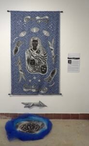 “Imna” por Marta María Rivera era una de las dos obras que daba la bienvenida en la pared introductoria de esta exposición y uno de los únicos dos grabados en esta muestra que le rendía tributo a una figura aun viva. Se trataba de Imna Arroyo, una artista plástica que se desempeña en el grabado, la pintura y la instalación trabajando, sobre todo, aspectos de la herencia afrodescendiente y las conexiones entre África y el Caribe con especial énfasis conceptual en la cultura yoruba. Arroyo suele hacer extensas referencias al mar y al relato que este narra sobre la historia colonial y esclavista, por lo que la presencia protagonista del azul y la iconografía marítima en esta pieza no fue una casualidad. El pedazo de mar que se escapaba de la pared al suelo provocaba la sensación de estar a la orilla de la playa mientras, físicamente, nos encontrábamos a la orilla de esta pieza. Aquí Rivera emuló el concepto práctico y temático de Arroyo, pero le arrojó su lente único al retratarla. Flotando al centro de un marco que parecía hacer referencia a las corrientes oceánicas, la artista retrató a la homenajeada en el núcleo metafórico de una fuerza marítima que viene y va con cultura, historia, dolor y sanación.