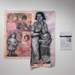 Una pieza más adelante convocó una especial pausa y mi detenida observación. Hablo de “Nilita Vientos Gastón: intelectual de muchos sombreros” por Ana Emmanuelli y Poli Marichal. Al tratarse tanto de un grabado como de un collage, la heterogeneidad de texturas, relieves y colores me casusó la sensación de estar frente a un rompecabezas poético que presentaba cada una de sus piezas como símbolo de la plétora actividad intelectual de esta homenajeada. Nilita Vientos Gastón fue abogada, profesora, crítica literaria, promotora de la cultura… una pieza a su nombre requería, sin duda, el efecto de pluralidad que las artistas supieron emplear. Las distintas Nilita Vientos que desplazaban por la obra, partían de la reinterpretación de fotografías reales, pero Emanuelli y Marichal se tomaron justas licencias creativas para proveerle al grabado un sentido simbólico y original. Para la Nilita en primer plano, por ejemplo, efectuaron un cambio de la estructura en la que esta descansa su codo izquierdo; en la foto original Vientos Gastón se recuesta de una enigmática pieza curvada, mientras que en el grabado se apoya sobre unos libros, reconocidos íconos del conocimiento, que a su vez le sirven de remate a una columna jónica, asociada en ocasiones a la fuerza y la sofisticación. Elementos como la ceiba, el viento, las olas y los tonos anaranjados de la composición, en una interpretación libre, podían recordarnos a los cuatro elementos de la naturaleza y a la entereza intelectual de esta ilustre figura de la historia puertorriqueña.