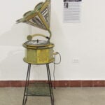 La pieza de Rubildo López y Víctor Oliver, “Gramófono gráfico de Rafael Hernández” fue una de las dos instalaciones presentes. Hernández, insigne compositor puertorriqueño conocido como “El Jibarito” es aquí celebrado por medio de una simulación del instrumento más utilizado para la reproducción de sonido hasta mediados del siglo XX, dando la impresión de que se había viajado a la temporalidad del propio homenajeado. La parte interior de la corneta fue grabada con algunos títulos de las más famosas composiciones de Hernández junto a una serie de gandules en vaina como una posible referencia a la labor agricultora de la que se origina su apodo. El gramófono podía interpretarse, en el contexto de esta exposición, como un retrato escultórico de Rafael Hernández; como el cuerpo simbólico del propio compositor puertorriqueño. Por ello, su fotografía en la cartela informativa pudo haber sido suficiente para hacer memoria de su apariencia física, pero los artistas decidieron incluir un grabado de su rostro en el disco simulado logrando metaforizar aun más la fisicalidad de su tiempo en vida y la materialidad de su legado. Otro aspecto peculiar de esta pieza, y quizá el que más me conmovió, fue el enchufe colgante junto a una toma de corriente. Ya hubiese sido sugerido por los artistas o el curador, me pareció un efecto jocoso que me generó la sensación (como quizá a muchos otros espectadores) de que lo único que se necesitaba para escuchar las históricas melodías de el Jibarito era perder la suficiente vergüenza para conectar el enchufe.