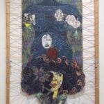 “Siempre subversiva Anjelamaría” por Lizzete Lugo y Sergio Arocho también ameritó una contemplación concentrada y calmada, y merece una especial mención. La homenajeada aquí fue la influyente poeta Anjelamaría Dávila, que dedicó buena parte de su arte literario a temas de la experiencia femenina en intersección con la experiencia afrodescendiente. Lugo expresó para los medios sociales de las Jornadas de Grabado Puertorriqueño como en su proceso investigativo para esta pieza, se enteró de que la poeta había padecido de Alzheimer y como esto impactó orgánicamente el proceso artístico ya que Sergio Arocho, la otra dotada mitad creativa de esta producción, padece la misma enfermedad. Se percibía una señalada importancia en el plano superior de este experimental grabado; un aparente llamado a prestarle atención a lo que liberaba su mente a modo de invitación para entrar en ella. De su cabeza se escapaban muchos de los versos que llegó a publicar, un torso (¿quizá el propio?), algunas figuras antropomorfas y un corazón que bombeaba sangre a lo largo de todo su cabello, presentándolo así como potencial símbolo de vida. Su rostro, construido por medio de un meticuloso collage, podía leerse como una representación tanto de las distintas capas creativas de la poeta como del complejo deterioro físico que causa el Alzheimer. Un leve e inconsciente acercamiento al dilema filosófico sobre la relación entre la mente y el cuerpo podía entreverse en esta exposición, y esta obra me resultó el reflejo máximo de ello. El talento intelectual de Anjelamaría, representado en sus versos, quedaba grabado como huésped de la mente y del cuerpo simultáneamente; como producto que surgía de su cabeza/mente, pero que a la vez quedaba manifestado en el torso/cuerpo. Aunque ello no se presentaba como un posicionamiento consciente sobre la discusión filosófica, pero quizá como una muestra triunfal del legado material sobre el olvido; de la memoria histórica sobre la muerte.
