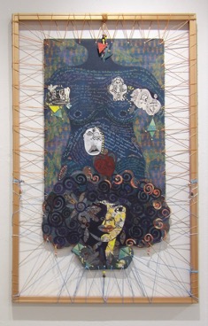 “Siempre subversiva Anjelamaría” por Lizzete Lugo y Sergio Arocho también ameritó una contemplación concentrada y calmada, y merece una especial mención. La homenajeada aquí fue la influyente poeta Anjelamaría Dávila, que dedicó buena parte de su arte literario a temas de la experiencia femenina en intersección con la experiencia afrodescendiente. Lugo expresó para los medios sociales de las Jornadas de Grabado Puertorriqueño como en su proceso investigativo para esta pieza, se enteró de que la poeta había padecido de Alzheimer y como esto impactó orgánicamente el proceso artístico ya que Sergio Arocho, la otra dotada mitad creativa de esta producción, padece la misma enfermedad. Se percibía una señalada importancia en el plano superior de este experimental grabado; un aparente llamado a prestarle atención a lo que liberaba su mente a modo de invitación para entrar en ella. De su cabeza se escapaban muchos de los versos que llegó a publicar, un torso (¿quizá el propio?), algunas figuras antropomorfas y un corazón que bombeaba sangre a lo largo de todo su cabello, presentándolo así como potencial símbolo de vida. Su rostro, construido por medio de un meticuloso collage, podía leerse como una representación tanto de las distintas capas creativas de la poeta como del complejo deterioro físico que causa el Alzheimer. Un leve e inconsciente acercamiento al dilema filosófico sobre la relación entre la mente y el cuerpo podía entreverse en esta exposición, y esta obra me resultó el reflejo máximo de ello. El talento intelectual de Anjelamaría, representado en sus versos, quedaba grabado como huésped de la mente y del cuerpo simultáneamente; como producto que surgía de su cabeza/mente, pero que a la vez quedaba manifestado en el torso/cuerpo. Aunque ello no se presentaba como un posicionamiento consciente sobre la discusión filosófica, pero quizá como una muestra triunfal del legado material sobre el olvido; de la memoria histórica sobre la muerte.