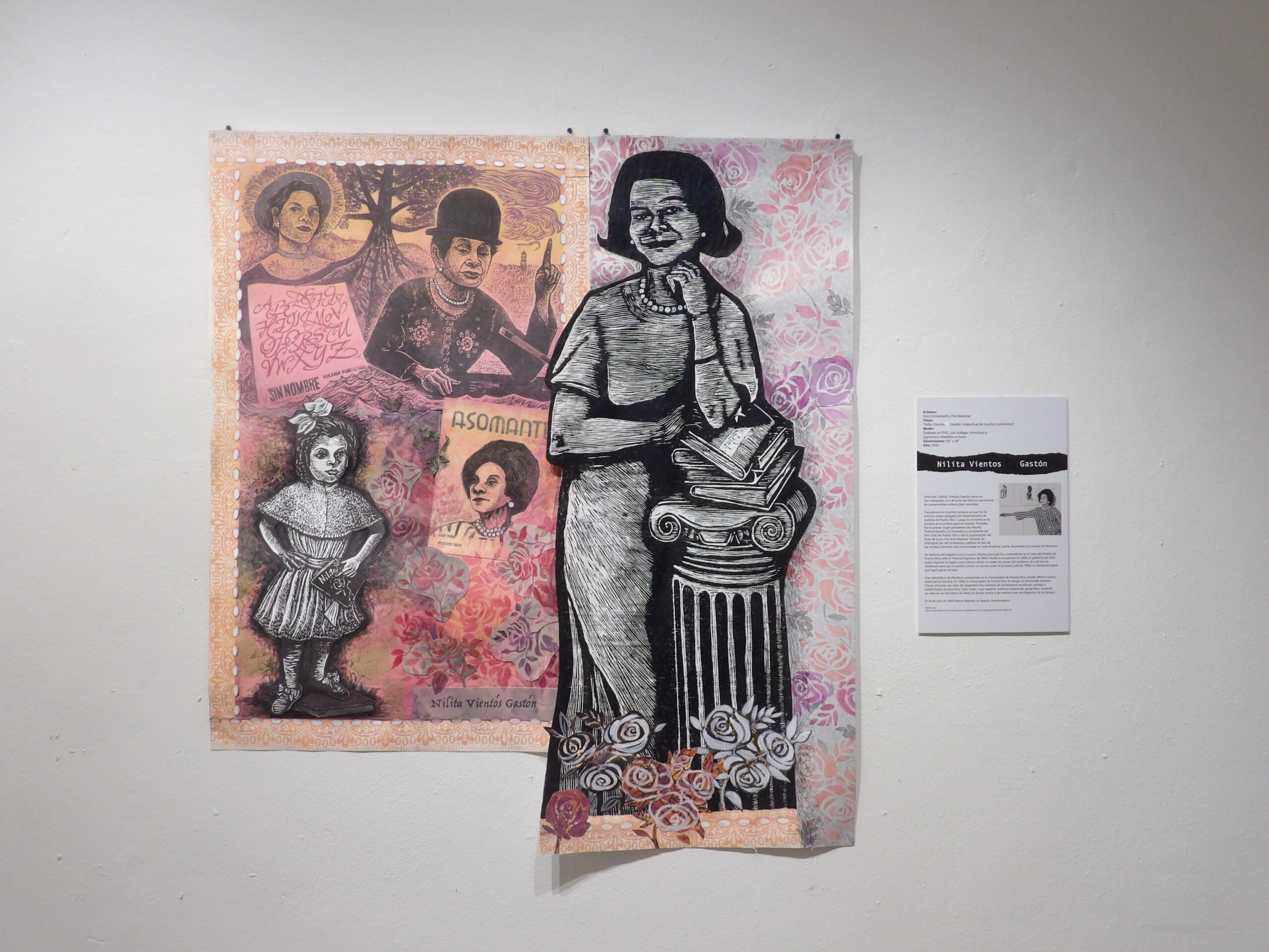Una pieza más adelante convocó una especial pausa y mi detenida observación. Hablo de “Nilita Vientos Gastón: intelectual de muchos sombreros” por Ana Emmanuelli y Poli Marichal. Al tratarse tanto de un grabado como de un collage, la heterogeneidad de texturas, relieves y colores me casusó la sensación de estar frente a un rompecabezas poético que presentaba cada una de sus piezas como símbolo de la plétora actividad intelectual de esta homenajeada. Nilita Vientos Gastón fue abogada, profesora, crítica literaria, promotora de la cultura… una pieza a su nombre requería, sin duda, el efecto de pluralidad que las artistas supieron emplear. Las distintas Nilita Vientos que desplazaban por la obra, partían de la reinterpretación de fotografías reales, pero Emanuelli y Marichal se tomaron justas licencias creativas para proveerle al grabado un sentido simbólico y original. Para la Nilita en primer plano, por ejemplo, efectuaron un cambio de la estructura en la que esta descansa su codo izquierdo; en la foto original Vientos Gastón se recuesta de una enigmática pieza curvada, mientras que en el grabado se apoya sobre unos libros, reconocidos íconos del conocimiento, que a su vez le sirven de remate a una columna jónica, asociada en ocasiones a la fuerza y la sofisticación. Elementos como la ceiba, el viento, las olas y los tonos anaranjados de la composición, en una interpretación libre, podían recordarnos a los cuatro elementos de la naturaleza y a la entereza intelectual de esta ilustre figura de la historia puertorriqueña.