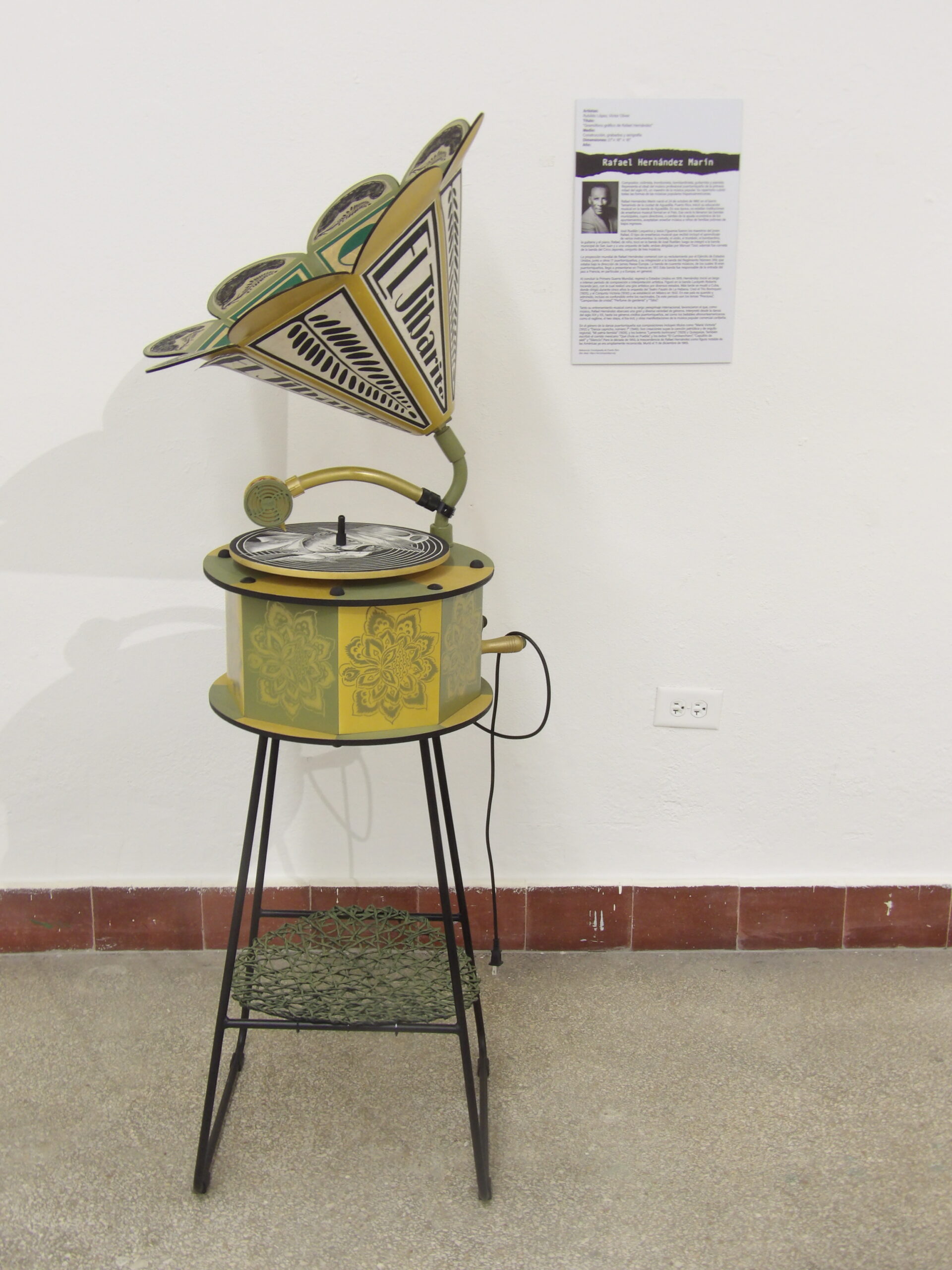 La pieza de Rubildo López y Víctor Oliver, “Gramófono gráfico de Rafael Hernández” fue una de las dos instalaciones presentes. Hernández, insigne compositor puertorriqueño conocido como “El Jibarito” es aquí celebrado por medio de una simulación del instrumento más utilizado para la reproducción de sonido hasta mediados del siglo XX, dando la impresión de que se había viajado a la temporalidad del propio homenajeado. La parte interior de la corneta fue grabada con algunos títulos de las más famosas composiciones de Hernández junto a una serie de gandules en vaina como una posible referencia a la labor agricultora de la que se origina su apodo. El gramófono podía interpretarse, en el contexto de esta exposición, como un retrato escultórico de Rafael Hernández; como el cuerpo simbólico del propio compositor puertorriqueño. Por ello, su fotografía en la cartela informativa pudo haber sido suficiente para hacer memoria de su apariencia física, pero los artistas decidieron incluir un grabado de su rostro en el disco simulado logrando metaforizar aun más la fisicalidad de su tiempo en vida y la materialidad de su legado. Otro aspecto peculiar de esta pieza, y quizá el que más me conmovió, fue el enchufe colgante junto a una toma de corriente. Ya hubiese sido sugerido por los artistas o el curador, me pareció un efecto jocoso que me generó la sensación (como quizá a muchos otros espectadores) de que lo único que se necesitaba para escuchar las históricas melodías de el Jibarito era perder la suficiente vergüenza para conectar el enchufe.
