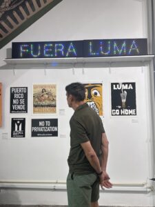 Como ya hemos dicho, la exposición, De AQuÍ NADie NoS SAcA, está inspirada en la residencia de Bad Bunny en PeERRe, No Me Quiero Ir De Aquí. Esta es una exposición articulada desde la resistencia, arte que se produce desde el interior de los movimientos sociales. Tuve el privilegio de hablar brevemente con Aliana Bigio y Jorge Díaz (Cano Cangrejo), de Mijente y AgitArte, respectivamente. Ambos estén claros. Es posible la comodificación del arte, es decir, que el arte se convieta en un objeto de consumo. Así, la capacidad de resistencia se vería comprometida convirtiéndose en un producto más. Sin embargo, la exposición muestra el arte que sale de las comunidades y de las organizaciones, no se trata de productos artísticos desde afuera, siguiendo los intereses del capital.