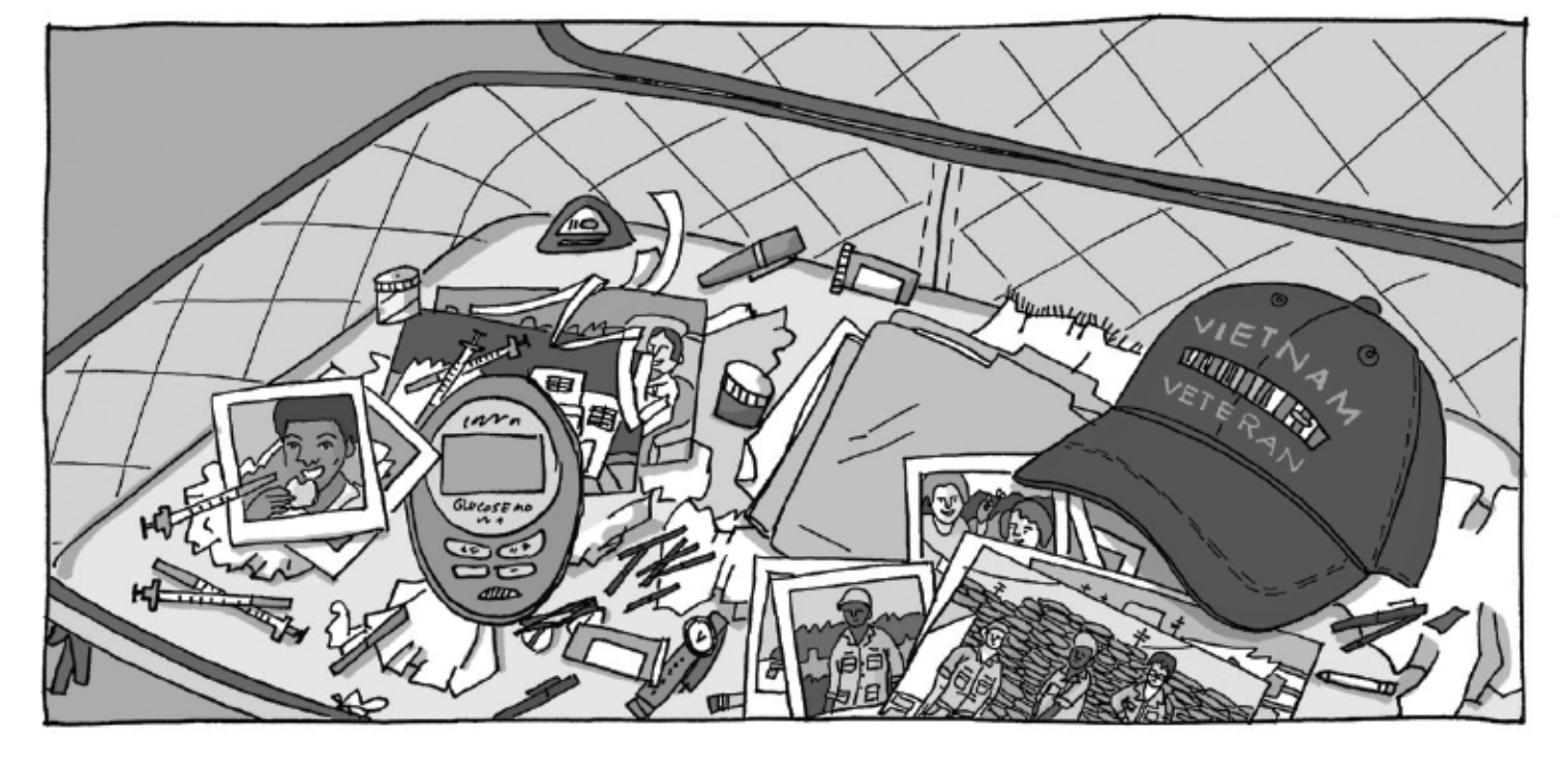 El cómic nos remite a una comunidad suburbana en San Juan, donde la ilustradora solía vivir. Una tarde, mientras caminaba a su mascota, notó las pertenencias y los restos de quien vivió en una casa, ahora vacía. Entre las bolsas de basura y algunos escombros, salta a la vista un maletín. Dentro, una vida en fragmentos: “Parece que encontré un mapa de quién fue esa persona, dónde estuvo, dónde vivió y quizás cómo murió”. La pequeña maleta guardaba sus medicinas para la diabetes, fotos de su familia, de sus viajes y del barrio. Rastros, sin nombre, de quien fue: un hombre, veterano de Vietnam y boricua. “No veo qué piensa sobre la guerra, sobre servir a Estados Unidos”, anota Rosaura. “No me aparece ninguna pista de cómo sobrevivió y por qué regresó a Puerto Rico. No sé si vio gente morir” continúa el cómic. “No sé si tuvo que matar a alguien” (57). “El Maletín” procura entonces reimaginar la vida de esta vida hasta restituirle, al menos, un descanso.