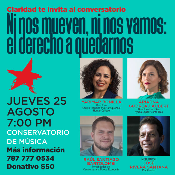 ¿Cómo entender y reaccionar ante este fenómeno que en el Puerto Rico colonial podría sacudir los cimientos mismos de nuestra convivencia como pueblo? ¿Qué puede hacer la gente de nuestros barrios, vecindarios y comunidades para defender su derecho a vivir en paz en el entorno en que siempre han vivido? ¿Cómo pueden contribuir las leyes y políticas públicas a alentar o desalentar esta práctica? Estas y otras preguntas relacionadas al impacto y consecuencias de la desenfrenada incursión de gente de fuera de Puerto Rico sobre familias, vecindarios, comunidades y pueblos serán parte de la discusión del Conversatorio Ni nos mueven, ni nos vamos. El derecho a quedarnos que auspicia el periódico CLARIDAD, y que tendrá lugar el jueves, 25 de agosto de 2022, a las 7 de la noche, en el teatro del Conservatorio de Música en Miramar.