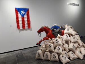 Para Garvin Sierra, sin embargo, vivir a lo boricua en esta colonia es más bien “sobrevivir las locuras, las injusticias o las incongruencias del gobierno”. En la exhibición, que reúne 11 piezas que ha venido trabajando desde el 2017 hasta el presente, el artista realiza un comentario punzante sobre cómo se sobrevive en Puerto Rico al margen de la estampa caribeña que representan las campañas turísticas. Los estragos causados por el huracán María, las protestas del Verano del 2019, la Junta de Control Fiscal, la situación colonial, la corrupción gubernamental son algunos de los temas tratados por Garvin en la muestra, que incluye instalaciones, construcción en madera, impresión digital o textiles.