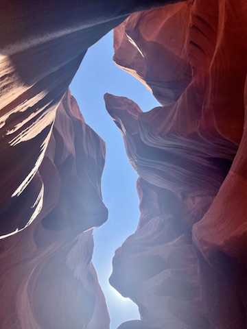 El muchacho navajo, con su mascarilla, nos muestra el Cañón del Antílope, un paisaje natural insólito, caleidoscópico, desconcertante. Este lugar tiene que ser único en el mundo. En esta maravilla de cañón, pequeño, multicolor, “el lugar donde el agua corre entre las piedras”, él se toma el tiempo y el trabajo para revelarnos algo más que lo evidente, que ya de por sí es muchísimo. Nos muestra los detalles, cada formación extraordinaria y su leyenda, cada rincón expresivo, los lugares con la luz exacta, con el dibujo natural para la foto (“¿qué ves ahí?”, “mira ahí el león”, “fíjate que acá se forma un bisonte”, “no dejes de fotografiar el caballito de mar”). Nos lleva por las artes rupestres, por las historias y leyendas tremendas que se han forjado en este lugar desde hace poco menos de 200 millones de años. En el fondo, toda esta región de cañones y montañas rojas con capas de rocas y acantilados coloridos, es un registro espectacular de la historia de la Tierra, sus erosiones, sus tiempos.