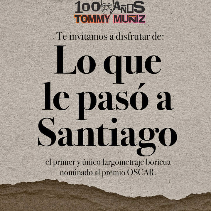 Este año celebramos el centenario de nuestro Tommy Muñiz y una de las actividades es la proyección en las salas de cine del 1er y único filme puertorriqueño nominado al Oscar por Mejor Película Extranjera: Lo que le pasó a Santiago. Tommy fue el protagonista del filme, escrito y dirigido por Jacobo Morales, que nos recuerda la trayectoria de nuestro cine y su desarrollo a través de gran diversidad de voces. Lo que le pasó a Santiago acaba de ser incluido en Filmografías comentadas en América Latina, tomo 1, coordinado por Javier Cossalter, como uno de los filmes más destacados de Puerto Rico. Este proyecto proviene de la Red de Investigadores sobre Cine Latinoamericano (RICiLa). Cito del libro: