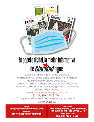 Durante 61 años, nada nos ha detenido. Esta pandemia nos ha dado duro pero hemos salido adelante con el apoyo de ustedes. Durante la primera semana de este esfuerzo recibimos donativos de buenos amigos y amigas de CLARIDAD. Si aún no lo has hecho, envía tu colaboración ahora mismo. $1, $5, $10, $50, $100…cualquier cantidad es buena y será muy agradecida.