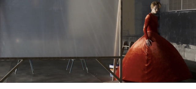 El vestuario del filme también permite trazar el uso de estos colores. La protagonista, que bien podría considerarse como una abstracción del tipo “chica Almodóvar”, se convierte en arquetipo a partir de la semiótica de su vestuario, caracterizado principalmente por el uso diseños monocromáticos de Demna Gvasalia, director de la casa Balenciaga. En las primeras escenas Tilda Swinton aparece en un vestido rojo, que destaca por las dimensiones de su crinolina, una falda amplia utilizada por mujeres acomodadas a lo largo del siglo XIX. La forma de campana de la falda alude al timbre del teléfono, objeto central tanto en el monólogo de Cocteau. Así, Swinton se convierte simultáneamente en caja de resonancia y badajo humano que produce una voz poética acotada por el lenguaje visual. El color rojo nos alerta del desbordamiento de la pasión y amor que siente la protagonista por su amante.