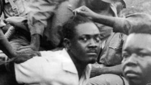 Patrice Lumumba fue líder de la independencia de el Congo. Tras conseguir la independencia formal, Congo siguió en lucha contra Bélgica y EEUUAA por las riquezas minerales del país. El imperialismo organiza golpe de estado y posterior ejecución: “La CIA mediante ‘Acción Ejecutiva’ ordena su asesinato, para favorecer los intereses de las multinacionales estadounidenses. … Al día siguiente, se hacen desaparecer los restos … ?”.