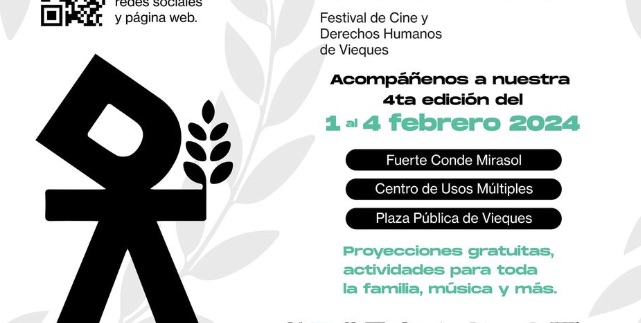 Esta cuarta edición del Festival de Cine y Derechos Humanos de Vieques se llevará a cabo del 1 al 4 de febrero de 2024 en el Centro de Usos Múltiples, Plaza Pública y Fuerte Conde Mirasol. Sin duda, el Festival de Cine y Derechos Humanos de Vieques se ha convertido en un destacado evento cultural en la región, sirviendo como plataforma para el mejor cine local e internacional y la promoción de la conciencia sobre temas de derechos humanos. A lo largo de los años, el festival ha fortalecido su compromiso con la diversidad, la inclusión y la celebración de las narrativas que desafían y transforman la percepción del mundo.