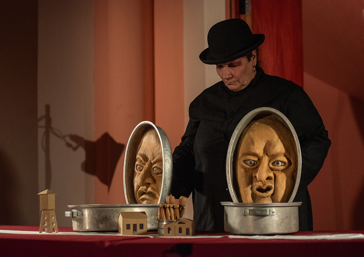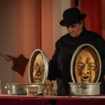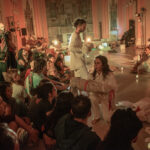 Lo próximo ¿cómo mover el público? De siete a ocho un barbero, mesas de comida, venta de comida caribeña. Espacio parecido a una fiesta patronal. Mezcolanza quiere reservar una hora al principio para esto. Luego lxs artistas, “el orden es lo que me divierte pensar”. Había dos grandes espacios la iglesia y el colegio. Espacios para desacralizar, sacralizar y volver a desacralizar y a sacralizar. La iglesia, inicia con Kianí en la puerta central del templo que recorre hasta apoderarse del púlpito (por supuesto) transformando su cuerpo en puente hacia otra dimensión. Desde el lado opuesto, Deborah abre el tema de Palestina con su extraordinaria propuesta, a la vez conmovedor juego de ollas-ciudad en fuego y las tapas-máscaras. Se sigue con el de Juan del Hierro a tres, también en la iglesia, aquí sentimos el templo y el ritual. Cambia el terreno del movimiento con el trabajo de Jaime Maldonado y Elise Legrand, agarran otros espacios y nos invitan a participar desde afuera y desde adentro por ejemplo lo que puede evocar un juego de pelota que transmite la radio. Fue un festival orientado al cuerpo.