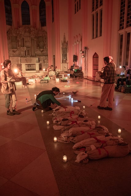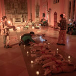 Sabemos que la propuesta de una presentación artística en espacios públicos y dirigiendo la movilidad del público son rutas que han sido transitadas anteriormente y seguirán con el paso de batón de lxs que vienen. En este sentido, también reconoce Ceballos: “Mezcolanza bebe de aguas anteriores”. Observé, que esta vez hubo algo particular hacia el público; fuimos acogidxs, atraidxs, protegidxs e imantados. ¿El fuego prometeico? nuestra primera tecnología. Algo funcionaba muy bien en la coordinación del equipo técnico y de producción. La iglesia lució siempre esplendorosa con la iluminación portátil (lxs asistentes de escena cargaron consigo los focos de un sitio para otro). Estuvieron muy bien articuladxs en su apoyo a lxs artistas y al manejo con el público.