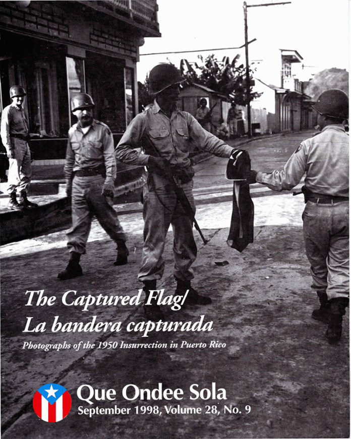 Este número de Que Ondee Sola, comisionada para Ramón como editor invitado, aborda el uso de la fotografía como prueba judicial en los procesos legales contra los insurgentes nacionalistas puertorriqueños tras la insurrección de 1950. Las imágenes, captadas por fotógrafos que acompañaban a los soldados del gobierno, fueron presentadas ante los tribunales y difundidas por los medios para encuadrar la revuelta desde una óptica federalista, subrayando el dominio estadounidense sobre Puerto Rico. Enumeradas y etiquetadas como evidencia legal, las fotos simbolizaban la represión del levantamiento: la bandera puertorriqueña era tratada como si fuese un arma del delito. Los soldados que la capturaron eran también puertorriqueños, uniformados con insignias de un ejército colonial, marcando así la persistencia del militarismo colonial en la isla.