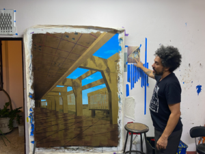 Su taller/estudio refleja esta constante construcción, los envases de pigmentos, la cinta adhesiva, las imágenes de referencia, los esténciles que cuelgan de la pared. Pero el artista está pronto a mudarse a otro espacio cercano. “Todas las veces que he formado un estudio y la vida me lo tumba.” nos dice. Es el reflejo, el efecto en el arte, de un pueblo en condiciones precarias, inestables, donde la impermanencia es la regla. “Es una piedra que entorpece la generación de artistas. Andamos como nómadas.” El no poder quedarse en un solo espacio altera la visión y producción del individuo. Pero lo hemos aceptado, aceptamos la precariedad.