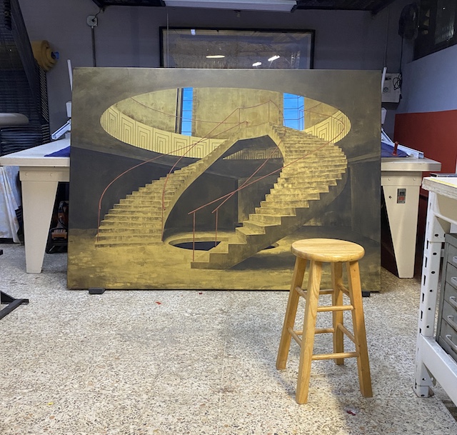 Rogelio Báez Vega toca a su perro, que se acuesta en el suelo frente a nosotros. Alrededor, algunos santos de palo antiguos nos miran desde sus rincones, y la obra de Rogelio nos cubre de color dorado. “El dorado es luz… Entender como rebota la luz en los edificios, los hace más grandes. El pigmento de oro no es color, sino que la luz rebota en el metal. Mientras más luz tiene, mas brilla.” Su uso recuerda los íconos Bizantinos, retratos y escenas que se remontan al siglo VI, en el que el oro invocaba la divinidad, la iluminación misma. Recuerda una vez en que un vecino, desconociendo que trabajaba en una obra de gran formato, con grandes cantidades de pigmento de oro, le preguntó qué era lo que tenía “en esa sala (su estudio), que parece fuego.”