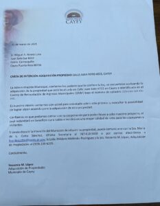 Además, compartió varias cartas en las que la administración municipal se compromete con no expropiar a los residentes de la comunidad Carrasquillo. Por ejemplo, una carta con fecha del 1 de diciembre de 2023 afirma que “no se expropiarán propiedades de quienes sean titulares de las mismas”, firmada por el mandatario municipal.