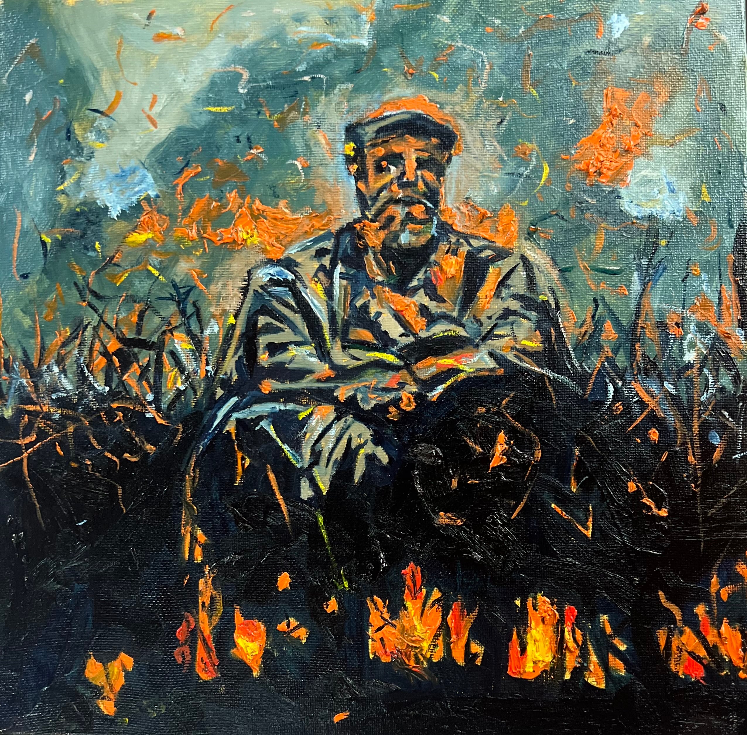 De igual modo, en estas obras el tiempo histórico (el pasado) y el tiempo actual confluyen bajo el dictamen de los mismos colores y las mismas sombras. El incendio es, hasta cierto punto, una ventana o puerta que ofrece miradas y encuentros con esos elementos del pasado que secretamente van unidos al alma. Debido a esto aparecen figuras de ancestros en completa armonía con las llamas del presente. Para ellos el fuego ha sido una invitación que el artista le ha hecho a que participen en el presente y escapen del olvido.