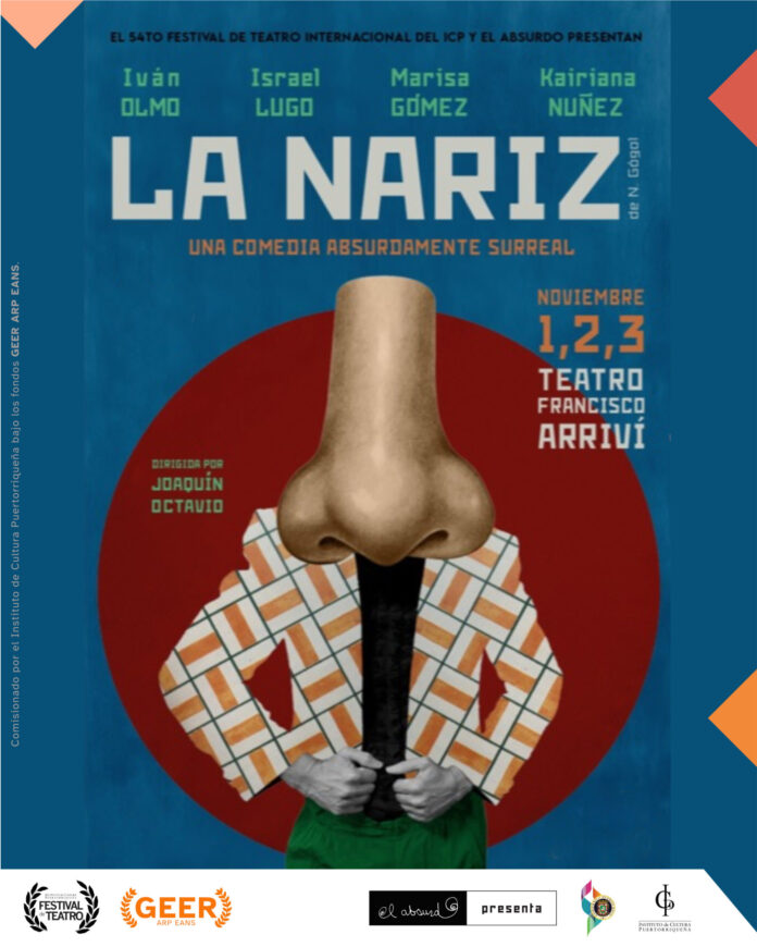 El cuento absurdista “La nariz” de Nikolai Gogol, en una versión teatral escrita y dirigida por Joaquín Octavio González, que abre nuevas funciones el 8, 9 y 10 de noviembre en el Teatro Francisco Arriví como parte del 54to Festival de Teatro Internacional del Instituto de Cultura Puertorriqueña.