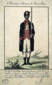 Y por último no menos interesante es ver en la obra El miliciano moreno ( pardo). La milicia fue y es una de las formas que han optado los negros libertos en todos los siglos. Fue una de las forma más inmediata de alcanzar estatus y mejor paga entre la población afropuertorriqueña. Pero claro, siempre jurando defender la corona. Esa imagen del miliciano moreno ( negro) es justo la representación de los defensores contra las invasiones inglesas a Puerto Rico,sobre todo la del 1797. Esa invasión le tocó vivirla Campeche y la deja plasmadas en los cuadros sobre la invasión inglesa y la obra El Miliciano pardo.[16]