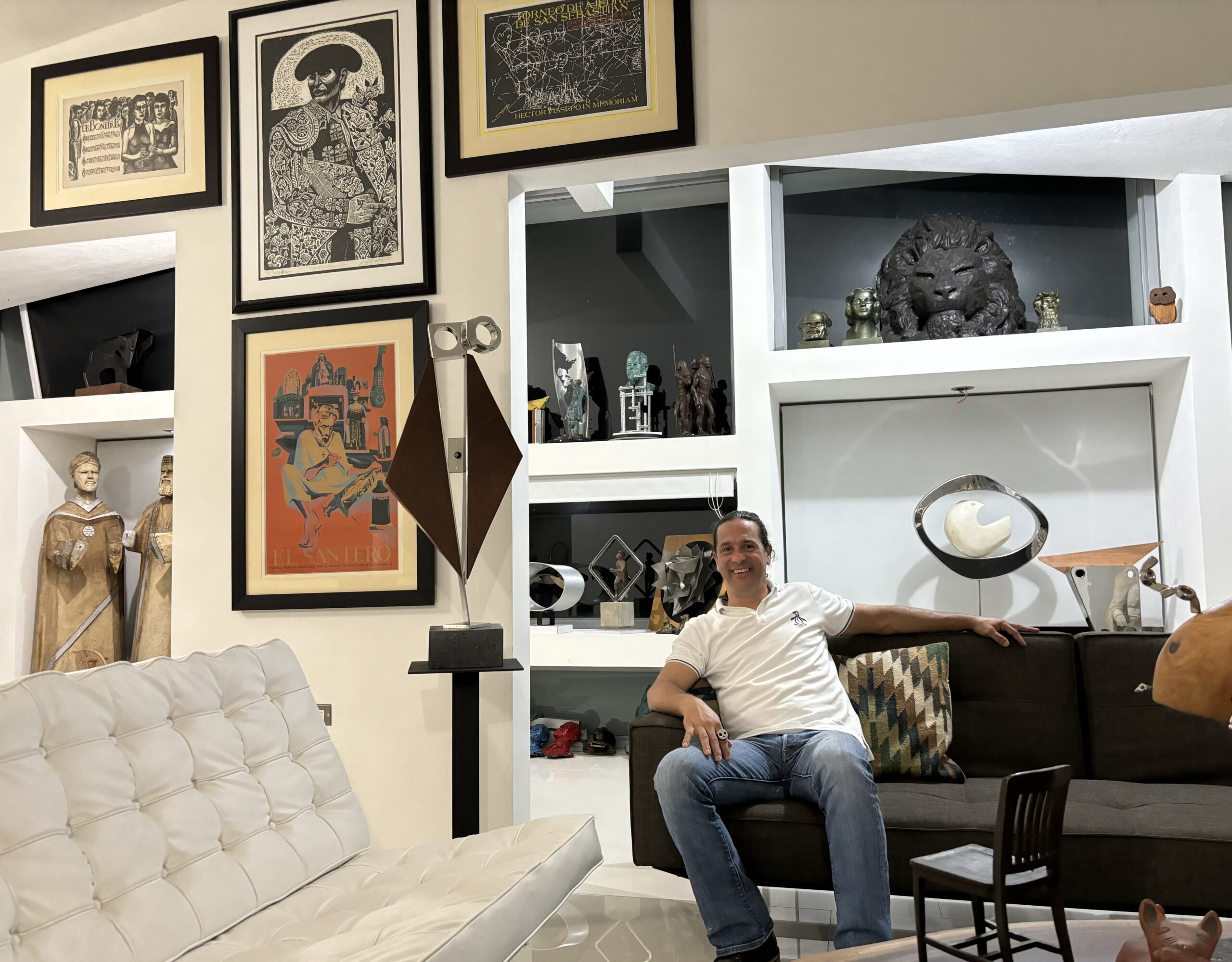 Subimos la escalera y, al abrir la puerta, vemos las formas, numerosas, inequívocas de la historia del arte puertorriqueño. Las obras cubren las paredes de manera elegante y se erige estatuaria a nuestro alrededor. Nos acercamos a la estantería, y estamos frente a Múcaro hoja. El acero inoxidable de este plasma el ave nocturna, pero la abstrae a su esencia, rememorando una hoja caída, perchada de manera precisa en el extremo de la base. Como en la concepción taína, es el “depredador que piensa”, pero también el que había robado plumas a todas las aves para vestirse. A su vez, la figura del múcaro denota un acto de reverencia ante López del Campo, quien trabajaba la imagen.