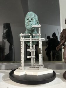 “Es tan importante lo que falta como lo que está.”, dice el escultor. El instante de cómo funciona la mirada; en ese espacio de lo no representado, se impregna lo propio, y por un instante, se rompen las leyes del universo. Ortiz trata que no toquen el suelo, buscando que cuestionemos, ya sea por un instante, si la obra flota. A su lado se posa el boceto para un monumento al escritor Enrique Laguerre; un busto elevado tras un azar de crucigrama con los títulos de sus obras literarias, en el que se pierde el soporte; levita sobre nosotros. “Nosotros nos manejamos bajo las leyes físicas, ellos (nuestros hombres y mujeres ilustres) no. Trascienden desde que estuvieron aquí.” comenta el artista. Recuerda a la virtud Confuciana del “Xiao”, que destaca la reverencia desde la humildad, el aceptar y venerar a aquellos que han estado por encima de nosotros. Ortiz busca elevar la representación de próceres, en su sentido pleno, a otro plano, porque plasmar su grandeza es materializar lo intangible.