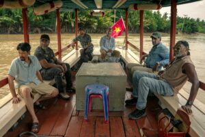 Paul, Otis, Eddie y Melvin llegan a Ciudad Ho Chi Minh a quedarse en uno de los lujosos hoteles hechos con el propósito de fomentar la industria del turismo. 47 años después de perder la guerra y darse la retirada de las tropas militares de los Estados Unidos (1973), estos cuatro excombatientes, viejos y con ínfulas de superioridad, se comportan como cualquier “gringo” que cree ser el conquistador del mundo aunque la historia señale que el pueblo y la nación unida de Vietnam sobrevivió y prosperó a pesar de los bombardeos, de la matanza de civiles (más de 2 millones), de la destrucción de sus tierras agrícolas y de haber perdido más de un millón de soldados durante los casi 20 años que duró la guerra imperial no declarada como tal. Tratan a su guía, VinhTran, como inferior, hablan mal de los viejos vietnamitas que encuentran en el hotel llamándolos Vietcong asesinos, insultan a un pescador que intenta venderle sus productos por su agresividad y se visten y caminan como lo haría cualquier turista no interesado en la historia. Solo otros europeos blancos parecen merecer su atención. Y aunque las transiciones entre presente y pasado impactan por no utilizar cambios físicos—ya que la guerra sigue viviendo en ellos—los incidentes en el anterior campo de batalla incluyen demasiadas historias ajenas y encuentros imaginarios y reales que se resuelven fácilmente a través del uso abusivo de estereotipos. Recomiendo el excelente artículo en el New York Times(June 24, 2020) del escritor Viet Thanh Nguyen de su percepción del filme.