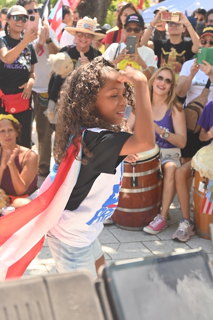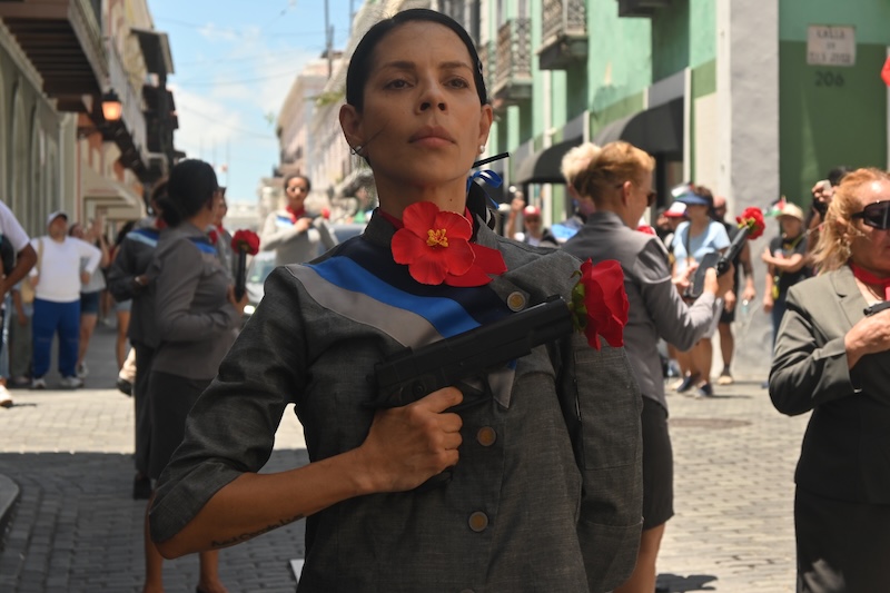 Mientras, la marcha continúa, las consignas, la música que nunca faltan. Antes de llegar a su destino, se hizo una parada frente a la Iglesia San Francisco en donde los trompetistas Orlando Marrero y Nicolás Santiago tocaron las piezas Verde Luz, el Himno Revolucionario y hasta la plena Qué bonita bandera, en memoria del fenecido líder del Ejército Popular Boricua, los Macheteros, Filiberto Ojeda Ríos, quien fue trompetista de profesión.