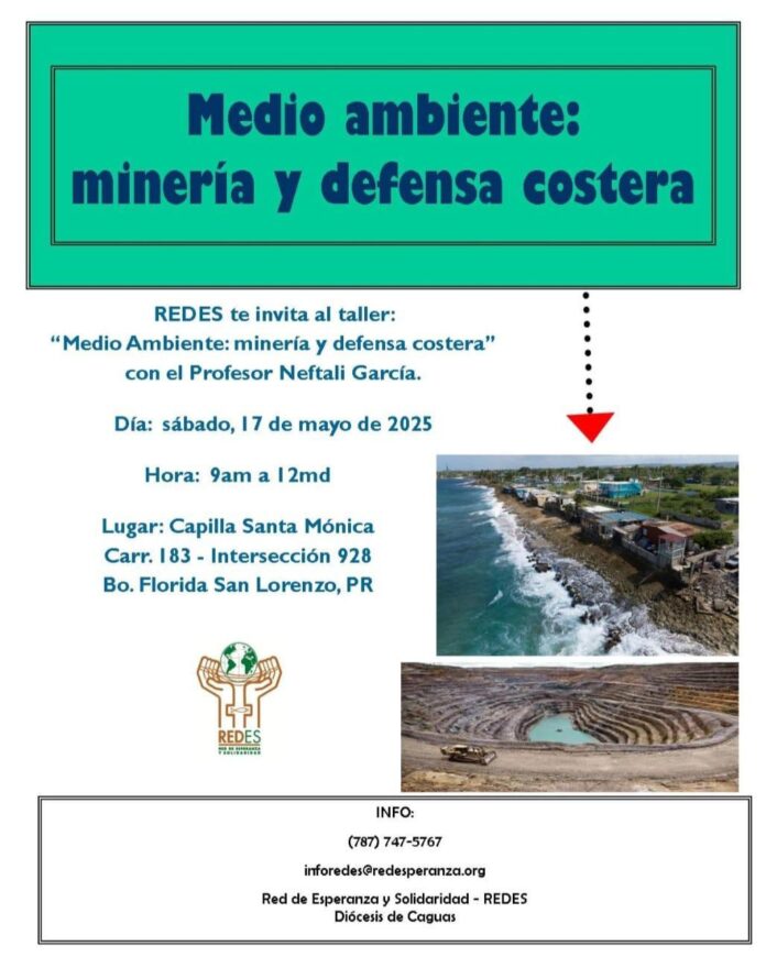 Red de Esperanza y Solidaridad (REDES) les invita al taller Medio ambiente minería y defensa costera con el profesor Neftalí García.La actividad se llevará a cabo el sábado 17 de mayo de 9am a 12md. en la Capilla Santa Mónica, sita Carr.183 intersección 928, Bo. Florida en San Lorenzo. Les esperamos.