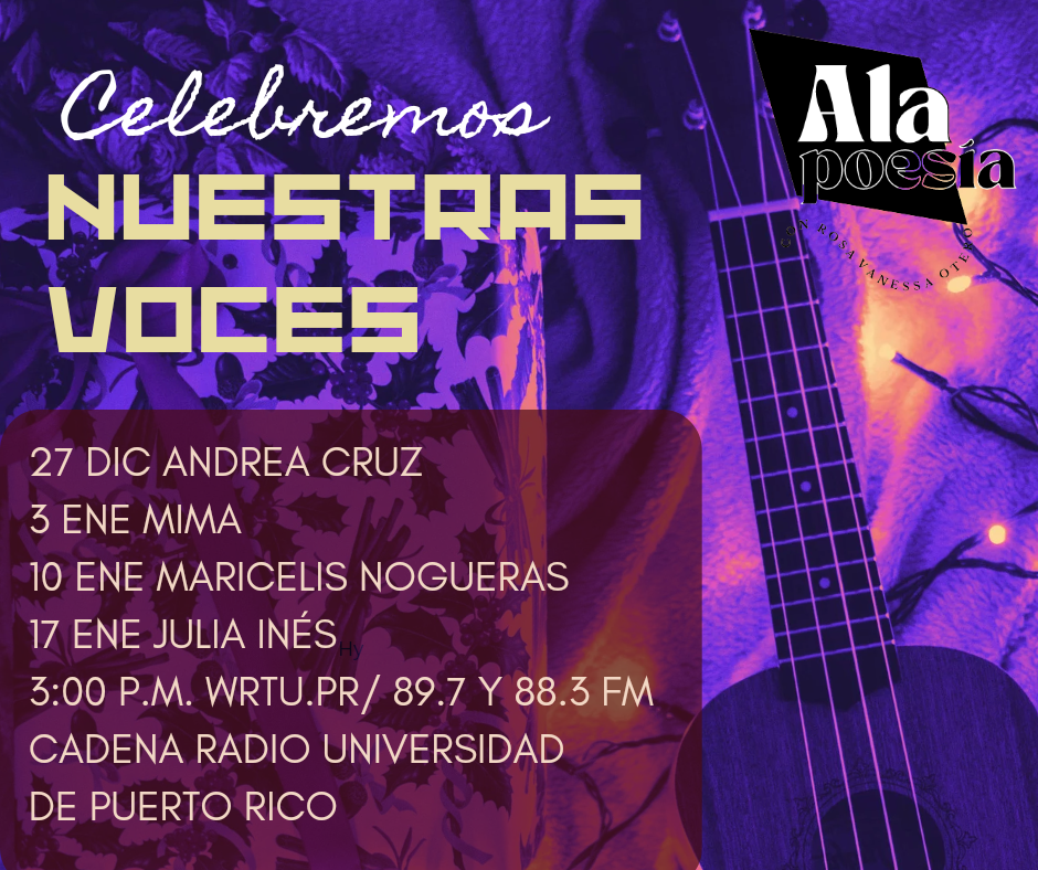 Valga esta extensa aunque incompleta nota a nuestro indie para anunciar una pequeña muestra de artistas que formarán parte de la primera serie especial “Celebremos nuestras voces” que se transmitirá a partir del 27 de diciembre de 2023 hasta el 17 de enero de 2024 en el programa radial y podcast Alapoesía de Cadena Radio Universidad de Puerto Rico.