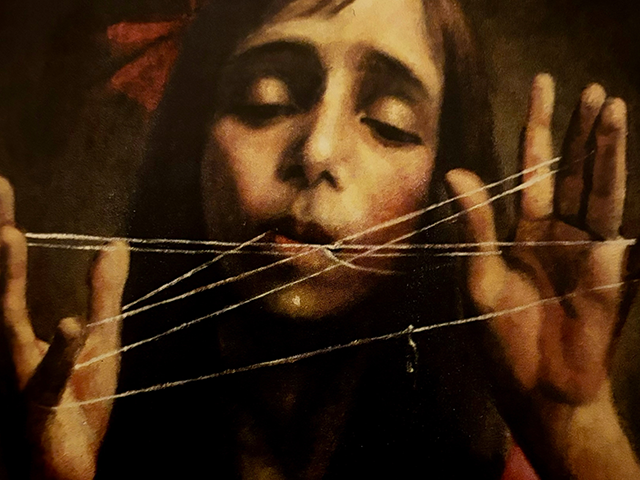 En la pared central, a la derecha en la sala, está ella, con sus manos enredadas en la cuerda. Es una obra de gran tamaño, un gliceé trabajado en el 2016, retocado por la mano de Osiris casi por completo. El trazo del rostro, los ojos, son los suyos. “Él me decía: ya le tengo título a esta, esta es La niña no está cuerda.” Jugando con las palabras mientras reía.