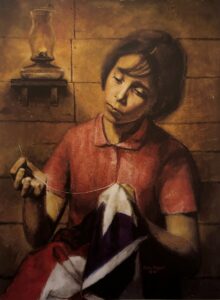 Al salir, noto en la entrada del apartamento, fijada a la pared junto a una gran bandera monoestrellada, Cosiendo. Gianina apunta a la mano que tiene la aguja, que va bordando, su mano, “Y esa aguja, eso fue otra cosa. Súbela,- bájala,- al lado,- no,- ahí.”