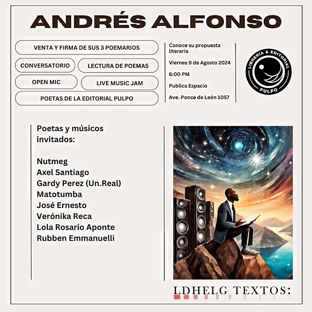 Pública Espacio se vuelve a convertir en lugar de cultura viva. El poeta Andrés Alfonso presentará sus poemarios en un conversatorio que, además, estará amenizado por músicos y otros bardos: Matotumba, Nutmeg, Verónika Reca, Lola Rosario, Gardy Pérez, José Ernesto, Axel Santiago y Rubben Emmanuelli.