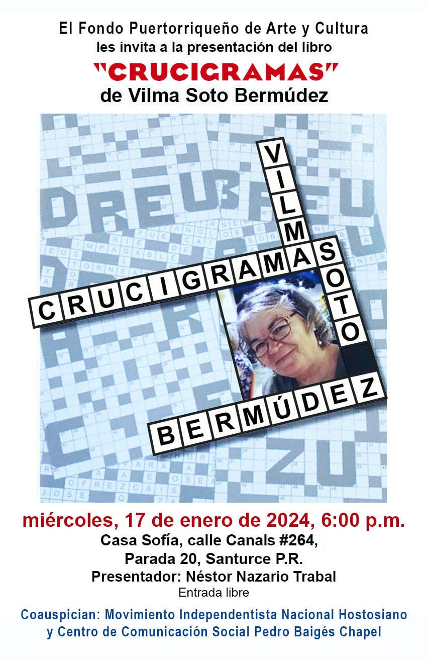 El libro se titula “Crucigramas” y su presentación estará a cargo de Néstor Nazario Trabal. En el prólogo Bernardo López Acevedo da cuentas de cómo Vilma adviene a ser una de las Crucigramistas más amplia y consecuente de este arte. Vilma agradece en este esfuerzo, el estímulo del Movimiento Pro Independencia (MPI), de CLARIDAD, de Bernardo, de Jorge Plard y de Rubén Ramírez, artista gráfico, caricaturista, su gran amigo desde los tiempos de Claridad en la calle Humacao, según Vilma. En sus crucigramas, nos encontramos con diversos patriotas de Puerto Rico y del Mundo.
